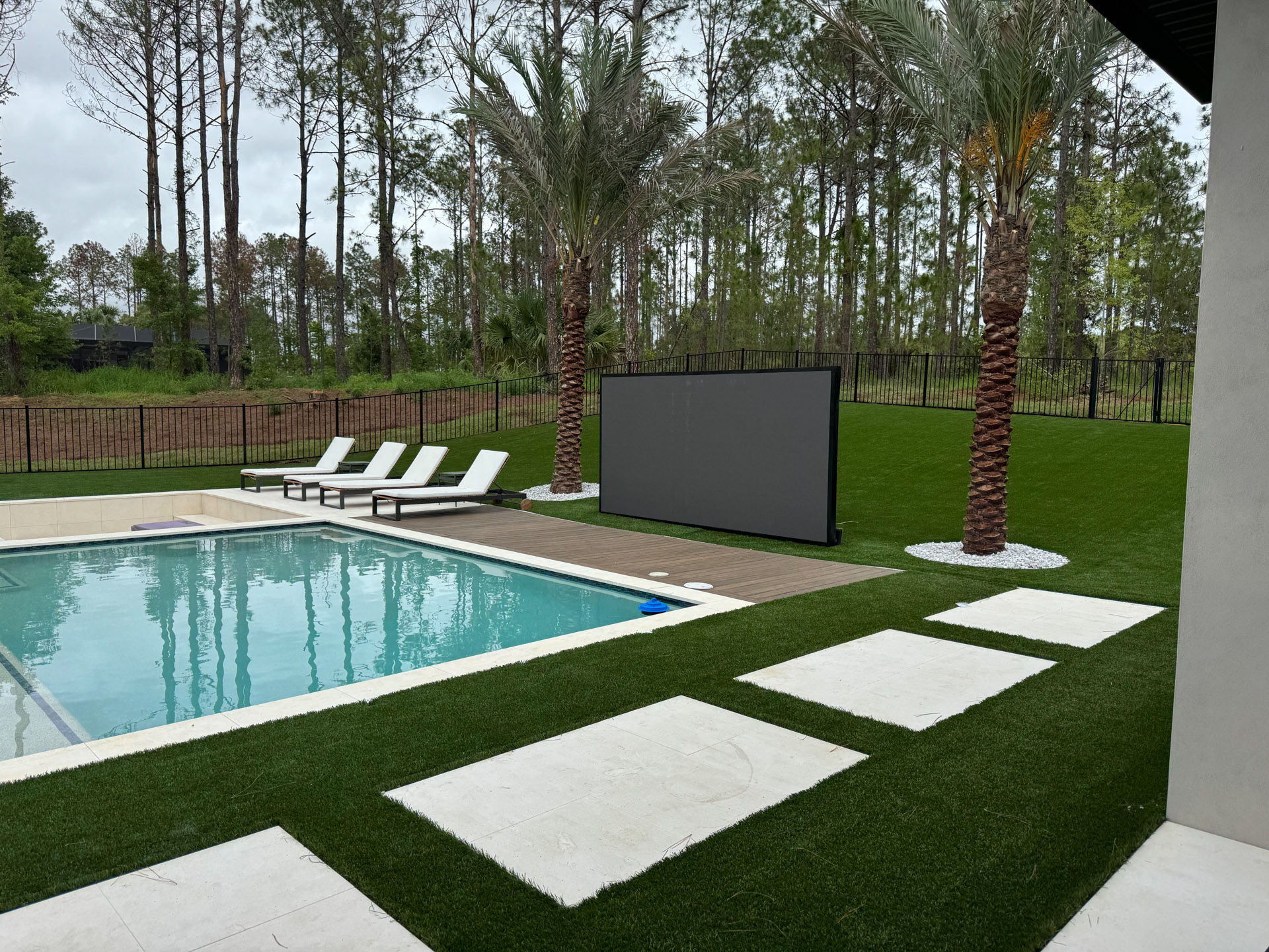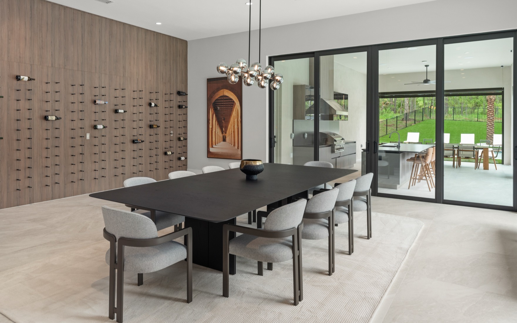 A bold expression of modern architecture...a newly completed custom estate in the guard-gated community of Bella Collina. Perfectly positioned on an elevated preserve lot, this striking residence features clean lines, dramatic symmetry, and a tiered water feature leading to an impressive entry. Inside, over 6,400 square feet of designer-curated interiors present a seamless blend of minimalism and warmth. The main living space showcases soaring ceilings, expansive sliders, and a sleek chef’s kitchen with integrated appliances, custom cabinetry, and a concealed catering kitchen. A floor-to-ceiling wine wall accents the formal dining area, while the grand living room invites effortless indoor-outdoor living. The serene primary suite overlooks a courtyard, separating the main home from the detached gym and guest quarters, and includes a spa-inspired bath with separate walk-in closets for him and her, each custom-designed with integrated lighting and modern finishes. Two guest bedrooms with ensuite baths, a media room, and a third guest suite which also functions beautifully as a flex space complete the interior layout. Across the courtyard, private wellness and guest suite provides incredible flexibility with a full in-law suite including an ensuite bath, a private gym, a sauna with indoor shower, a full kitchen (no oven), and lounge space—all with direct access to the pool and a private outdoor shower. Enjoy resort-level living with a summer kitchen, sunken firepit, and a show-stopping pool and spa complete with water features and a retractable movie screen
