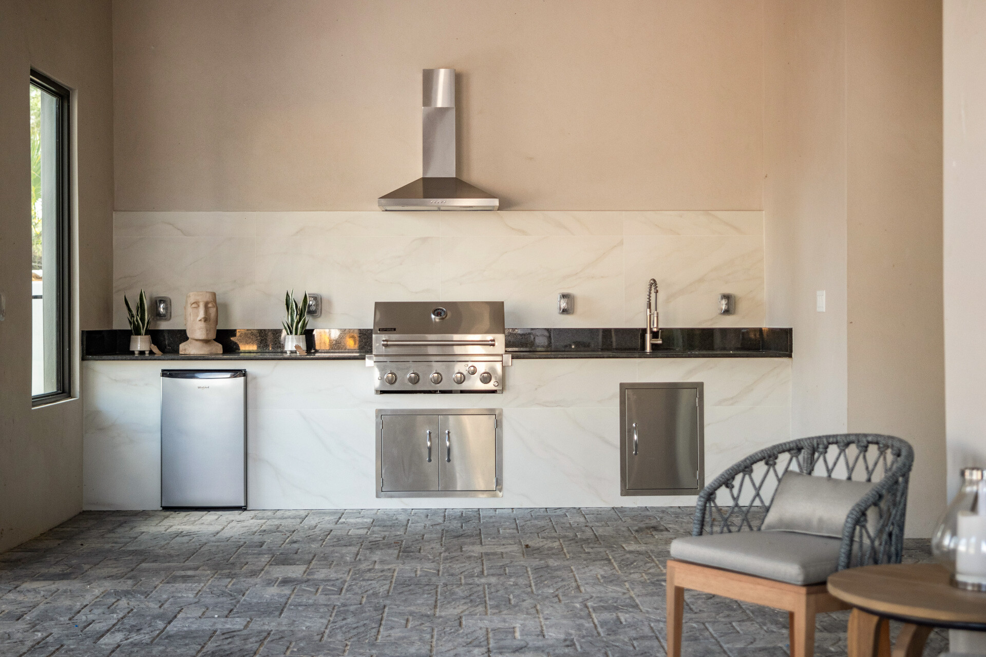 The oversized lanai and backyard living areas are ideal for entertaining, with several covered sitting and dining areas, along with remote-controlled screens. The outdoor kitchen and grilling area offer plenty of counter space, a fridge, sink, and easy access to the main kitchen. A first-floor office can also double as a guest room.