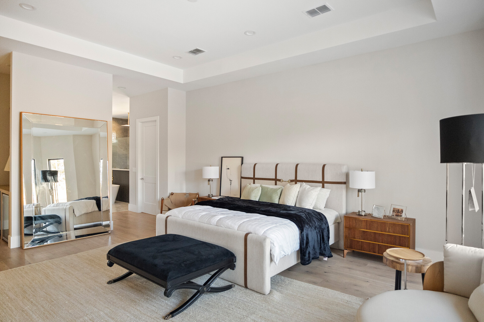The first-floor primary bedroom offers a coffee bar with a beverage fridge, and large bay windows provide plenty of natural sunlight, along with a sitting area overlooking the pool and lanai. The ensuite bathroom features a dual-entry shower with two rain heads, a double vanity, soaking tub, and two walk-in closets. Three additional bedrooms and a loft on the second floor are perfect for family members or guests.