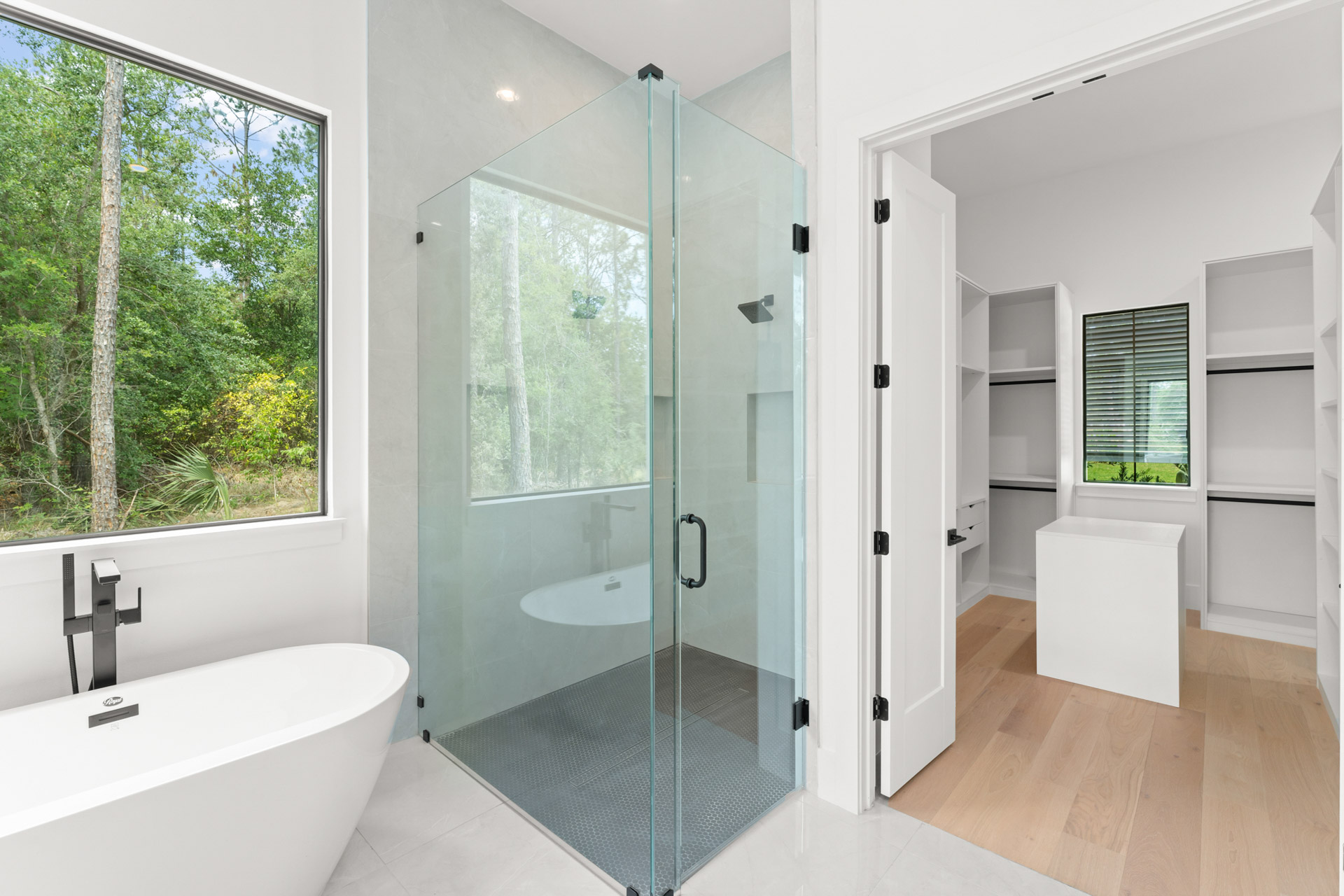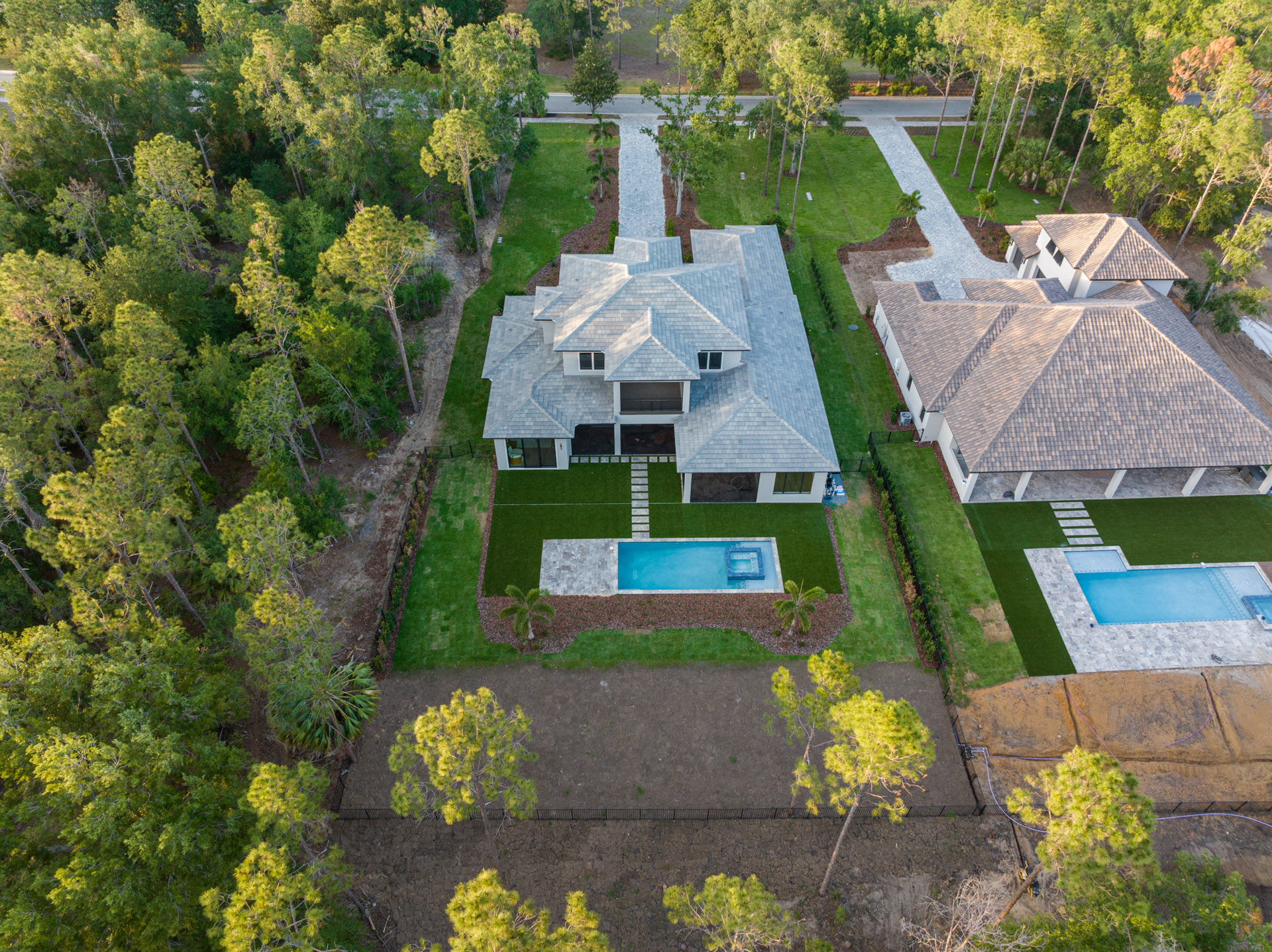 The first-floor primary suite is a peaceful retreat with his and hers walk-in closets, dual vanities, a luxurious shower, and a soaking tub. A private guest suite with an en suite bath and French doors opens to the backyard. Additional highlights include a spacious home office, a functional mudroom, and a laundry room with a dog wash station, utility sink, and ample storage.