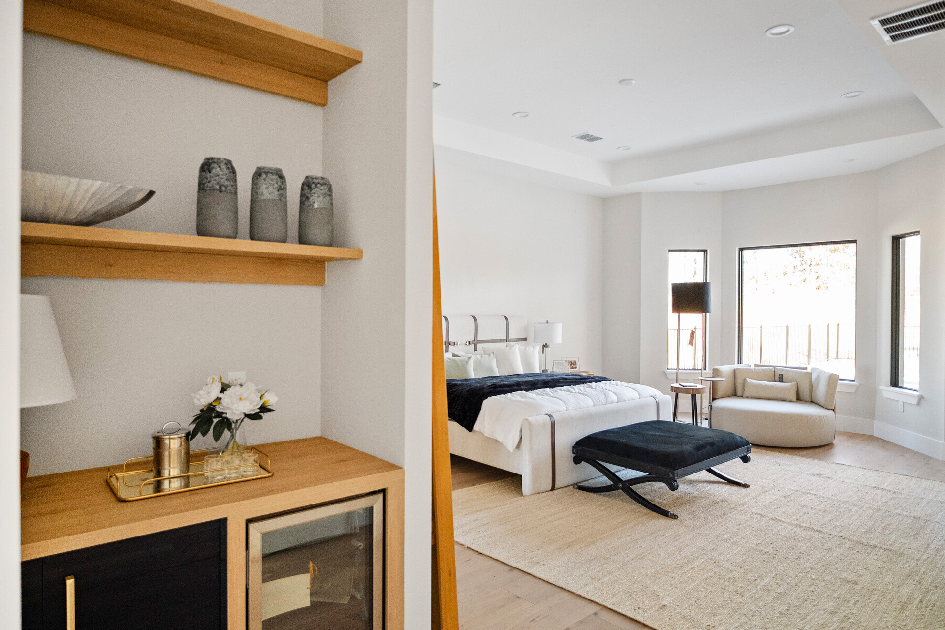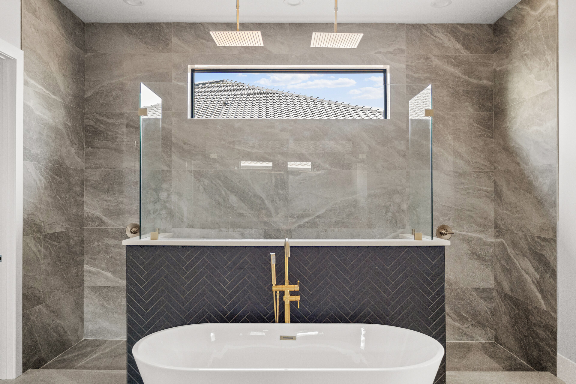 The first-floor primary bedroom offers a coffee bar with a beverage fridge, and large bay windows provide plenty of natural sunlight, along with a sitting area overlooking the pool and lanai. The ensuite bathroom features a dual-entry shower with two rain heads, a double vanity, soaking tub, and two walk-in closets. Three additional bedrooms and a loft on the second floor are perfect for family members or guests.