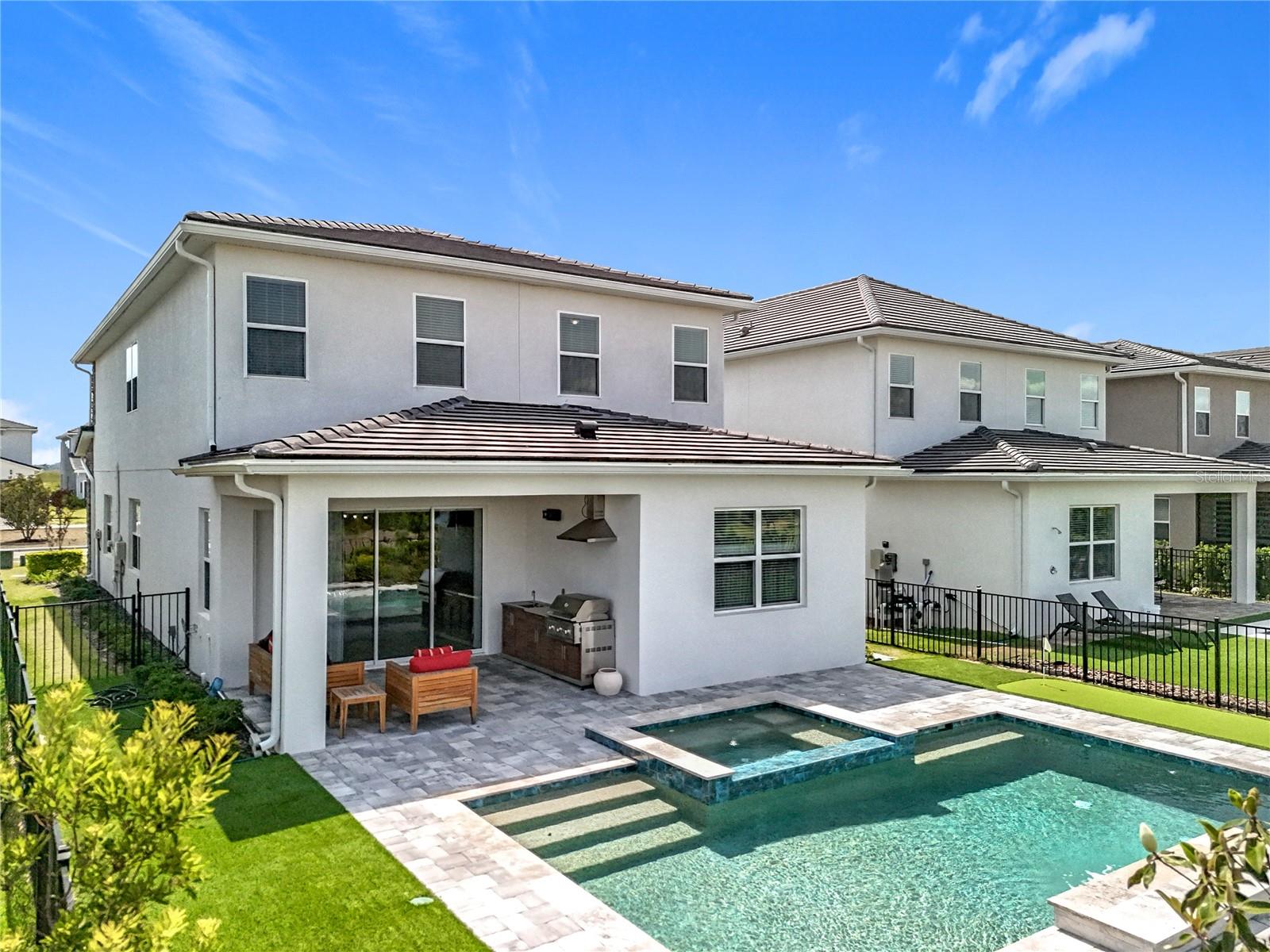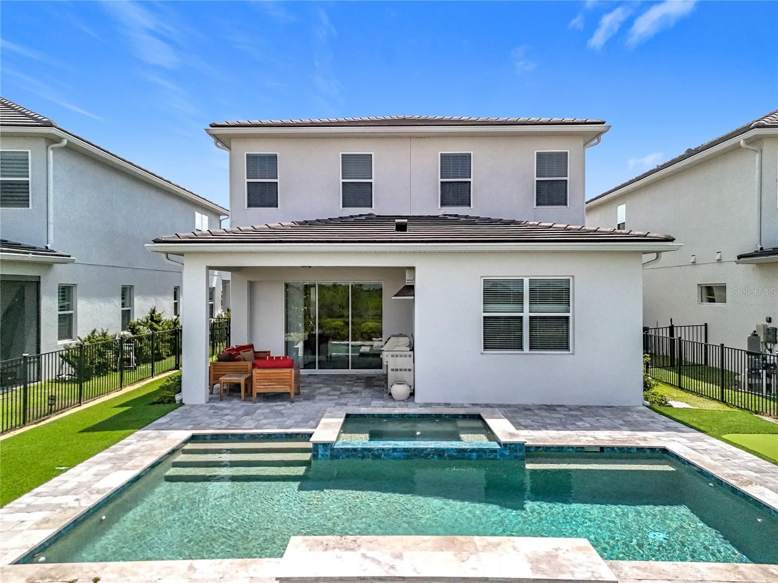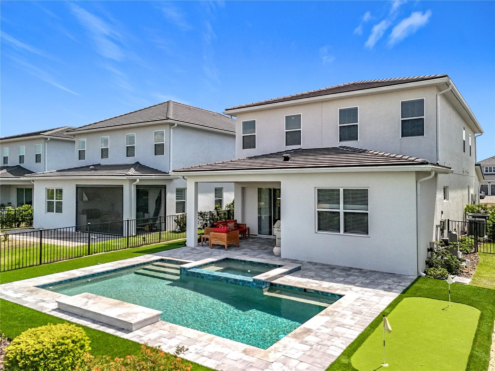 $40,000 Club Membership Incuded! Elegant golf course home with designer upgrades located on the green of the 4th hole of the Nick Faldo-designed Golf Course of Champions. This spacious residence offers refined living with thoughtful details throughout. The first-floor primary suite showcases panoramic golf views, a spa-style bathroom with a mosaic walk-in shower, double sinks, and a generous walk-in closet. The gourmet kitchen features stainless steel appliances, gas stove, farmhouse sink, and ample cabinetry. Upstairs includes a large bonus room and four guest bedrooms with stunning course views. Step outside to your private backyard oasis featuring a heated saltwater pool, spa, putting green, and tropical landscaping—ideal for entertaining or relaxing. The 2-car garage is finished with epoxy floors and keypad entry. Residents of Bella Collina enjoy luxury amenities including fine dining, full-service spa, fitness center, tennis, pickleball, basketball courts, walking trails, private boat ramp, and proximity to the renowned schools and attractions.